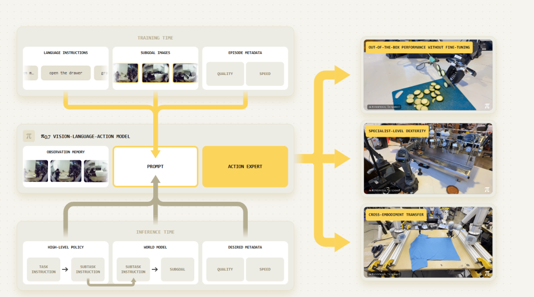 在这样的方式下,专家模型的能力来自对某一个任务的深度拟合。而π0.7的路径完全不同,它并没有针对这些任务做额外训练,主要依赖已有能力的组合与重用。