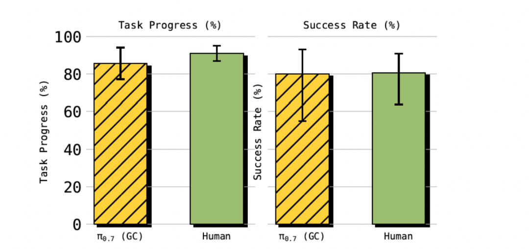 与之对应的是,10个平均有375小时遥操经验人类操作员,他们的完成度是90.9%,完成度是差不多的。不过π0.7在数据方面,比起人类没有优势。