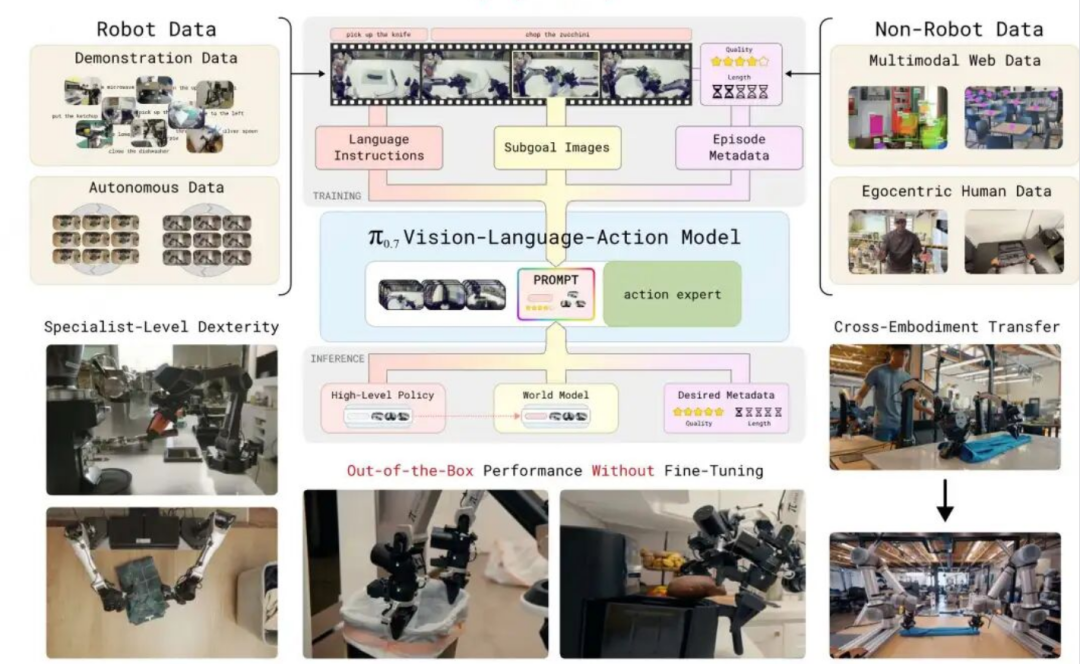 但机器人领域各种硬件层出不穷,软件的跨本体泛化能力就是PI必须要考虑的问题,所以这也是π0.7的重点能力之一。