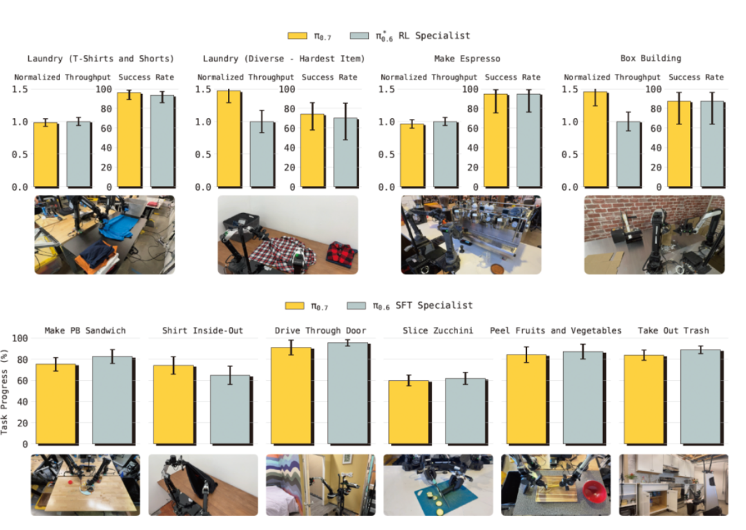 但π0.7开箱即用的属性展现了其通才的潜力,根据相关实验数据,在做咖啡、叠衣服、装箱几个任务上,尽管π0.7没有对这些任务进行专门训练,但水平依然追平了π0.6微调过的专家模型RL specialist和SFT specialist。