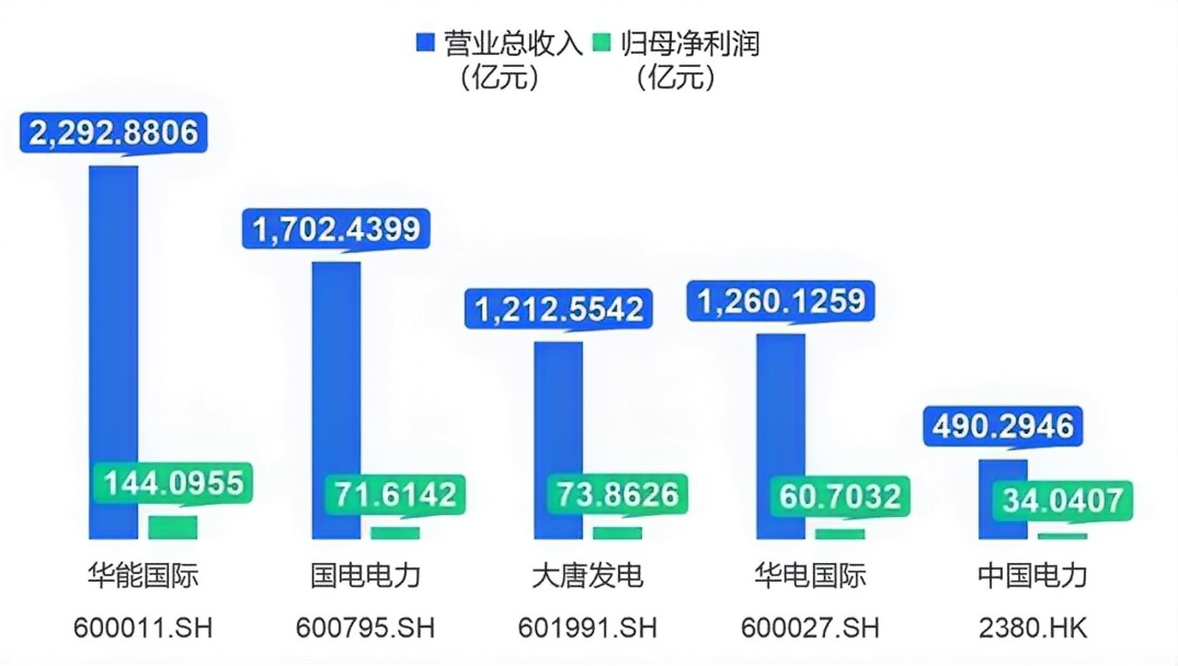 其中,华能国际以营收2292.88亿元、归母净利润144.1亿元高居榜首,成为五大企业中唯一营收破两千亿、盈利超百亿的上市公司,与其他企业拉开较大差距。华电国际因上网电量缩减明显,去年营收1260亿元,同比降幅达11%,为五家之最。