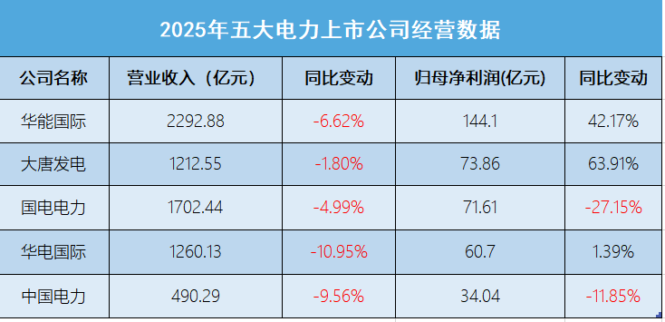过去的一年,多项重磅电力市场政策密集落地,在新能源全面入市、现货市场覆盖面扩大趋势下,五大发电集团旗下核心上市公司2025年“成绩单”悉数出炉。