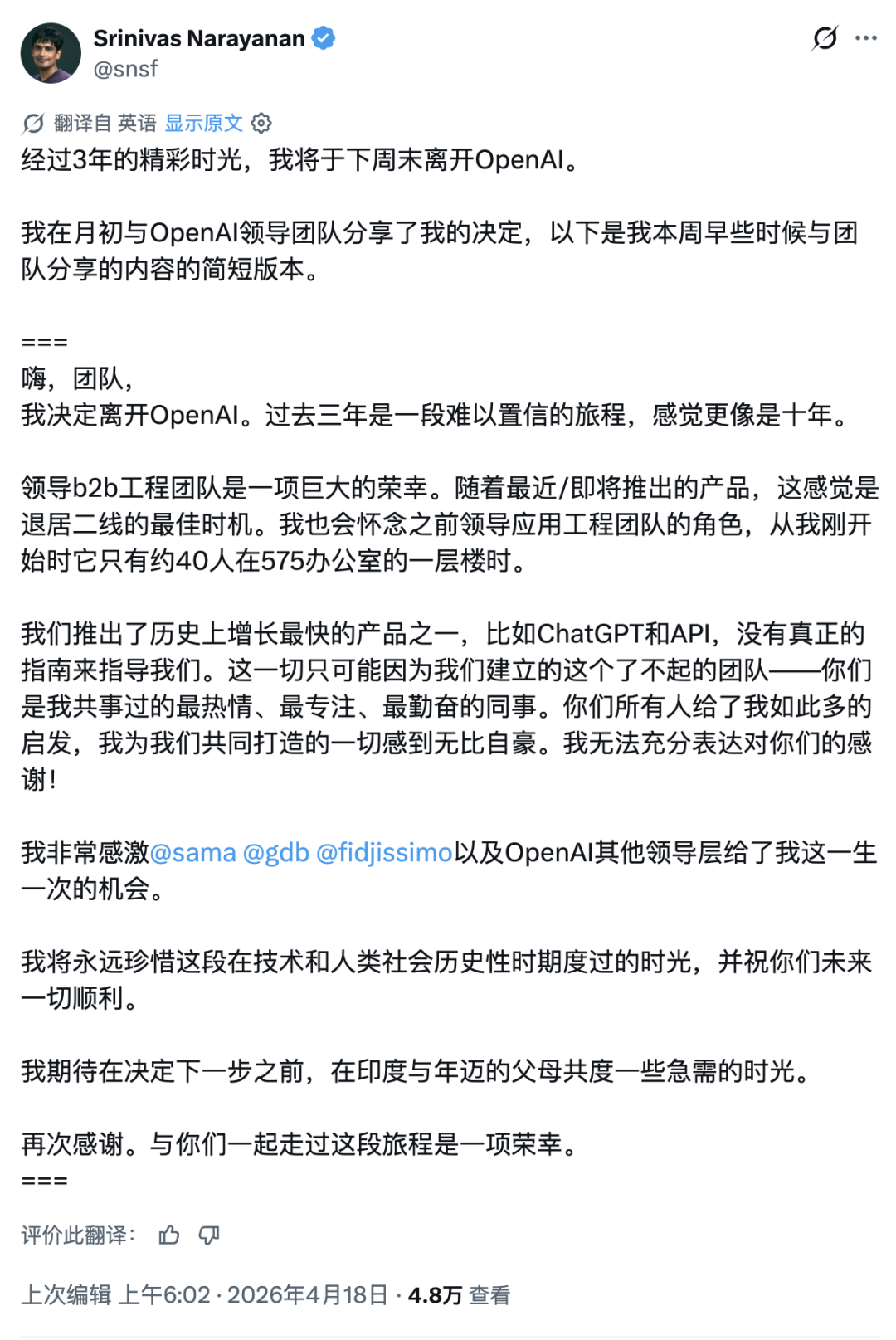 与此同时,OpenAI还有另一个内部动作,悄悄同步发生:企业应用CTO Srinivas Narayanan将于下周末离职,理由是回家陪家人。Narayanan此前是OpenAI工程VP。