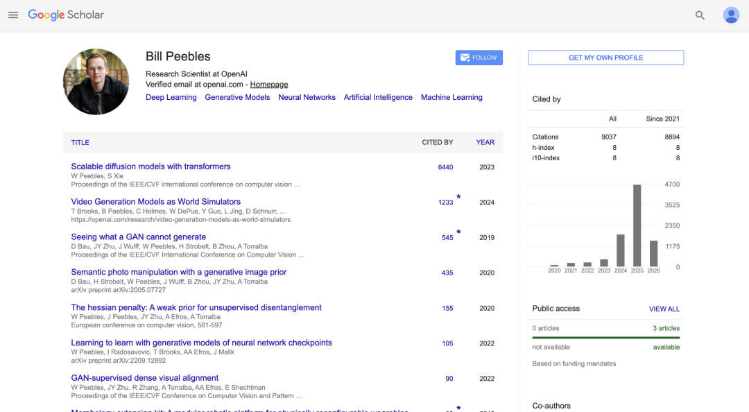 后来OpenAI在Sora的技术说明中明确表示,Sora采用的正是diffusion transformer架构。因此DiT通常被视为这一路线的重要先导工作。带着这套积累,Peebles加入OpenAI,和Tim Brooks、Aditya Ramesh一起,开始搞Sora。