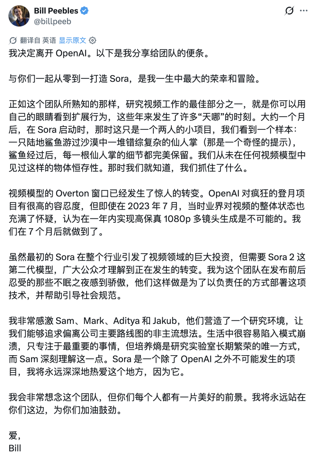 就在刚刚,Sora之父Bill Peebles正式官宣离职。