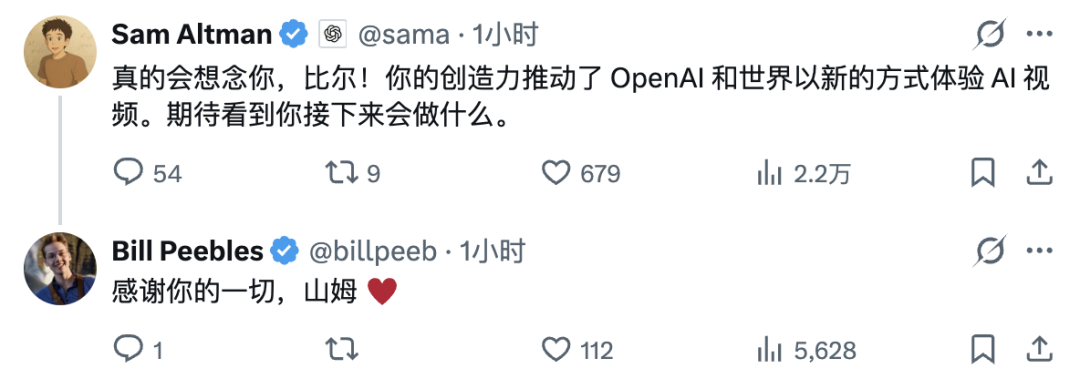OpenAI CEO Sam Altman(山姆·奥特曼)在评论区秒回:真的会很想念你,Bill,你的创造力让全世界以新的方式体验了AI视频,期待看你接下来做什么。