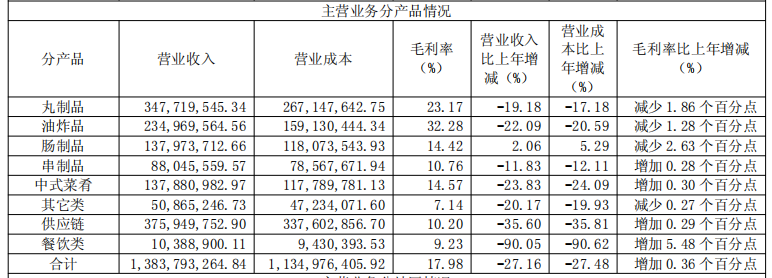 公司在年报中解释称,“受冻品市场竞争激烈和学校团餐市场政策变化的影响导致收入降低”;同时,“对联营和合营企业的投资收益减少了987.37万元,资产减值损失增加861.61万元,导致净利减少。”细究财报会发现,行业遇冷只是表象,业务失衡和战略误判或是导致其亏损的根源。