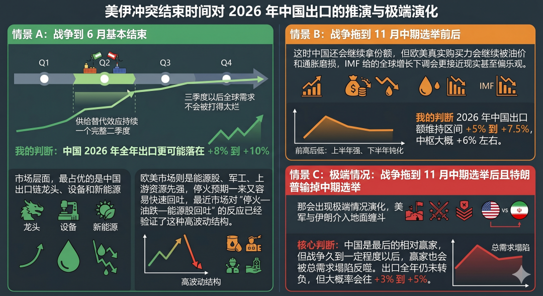 面对如此诡谲多变的全球宏观变量,将2026年的中国出口走势强行描绘为一条平滑的直线是极其危险且不负责任的。基于2025年全年出口增长5.5%的底盘,以及2026年一季度已然实现的14.7%高增长基数(但3月已回落至2.5%),我们必须引入时间与地缘的双重坐标,通过构建三种不同烈度梯级的宏观情景沙盘,来逼近2026年全年中国出口的真实轨迹。只要不落到最差的第三种状况2026年全年中国出口将稳固突破40000亿美金。