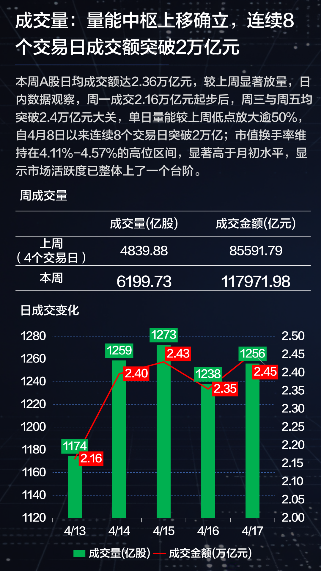 成交数据方面,全周A股日均成交额达到2.36万亿元,较上周明显放量,自4月8日以来已连续8个交易日成交额突破2万亿元,标志着市场量能中枢已完成上移。