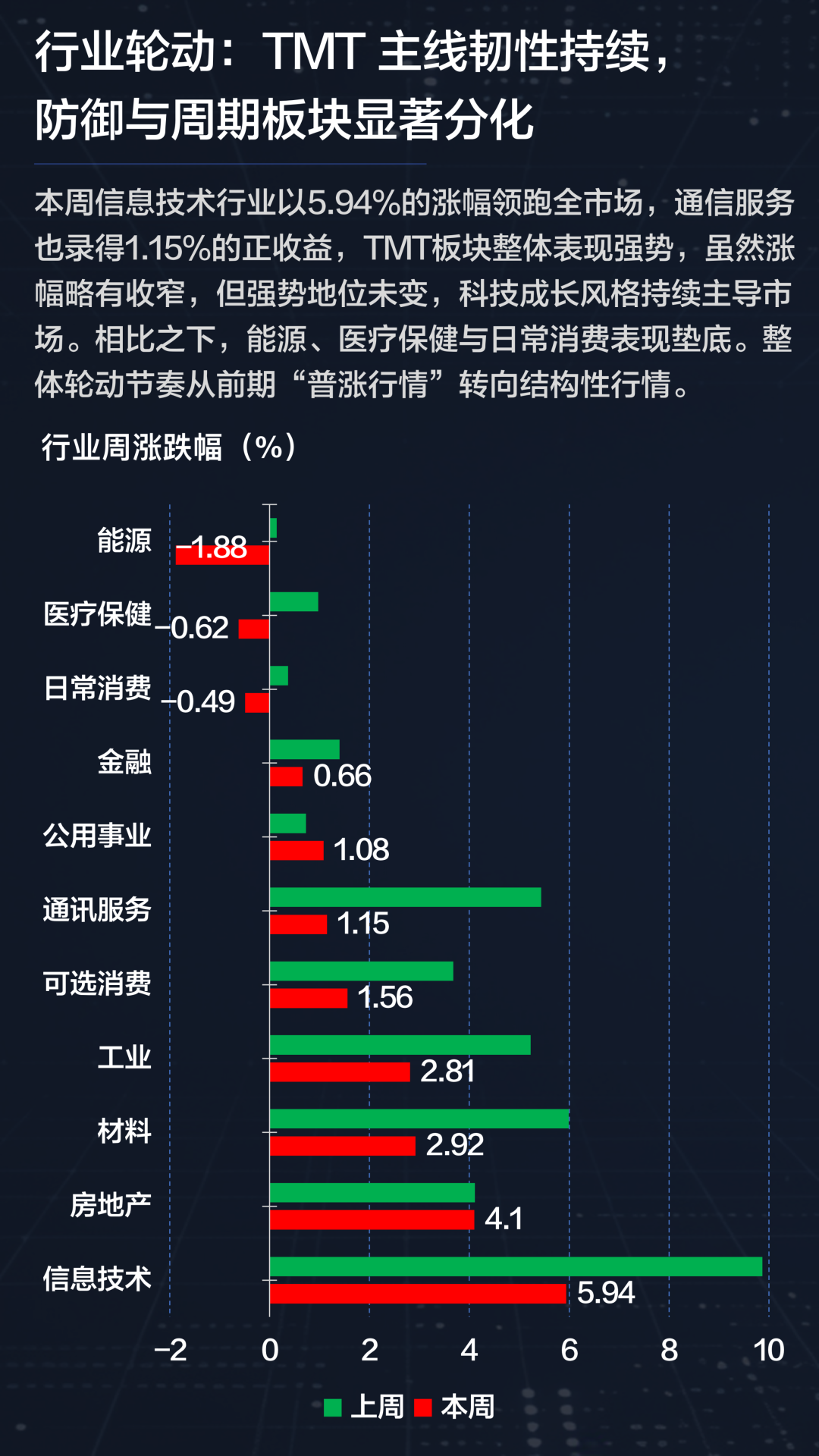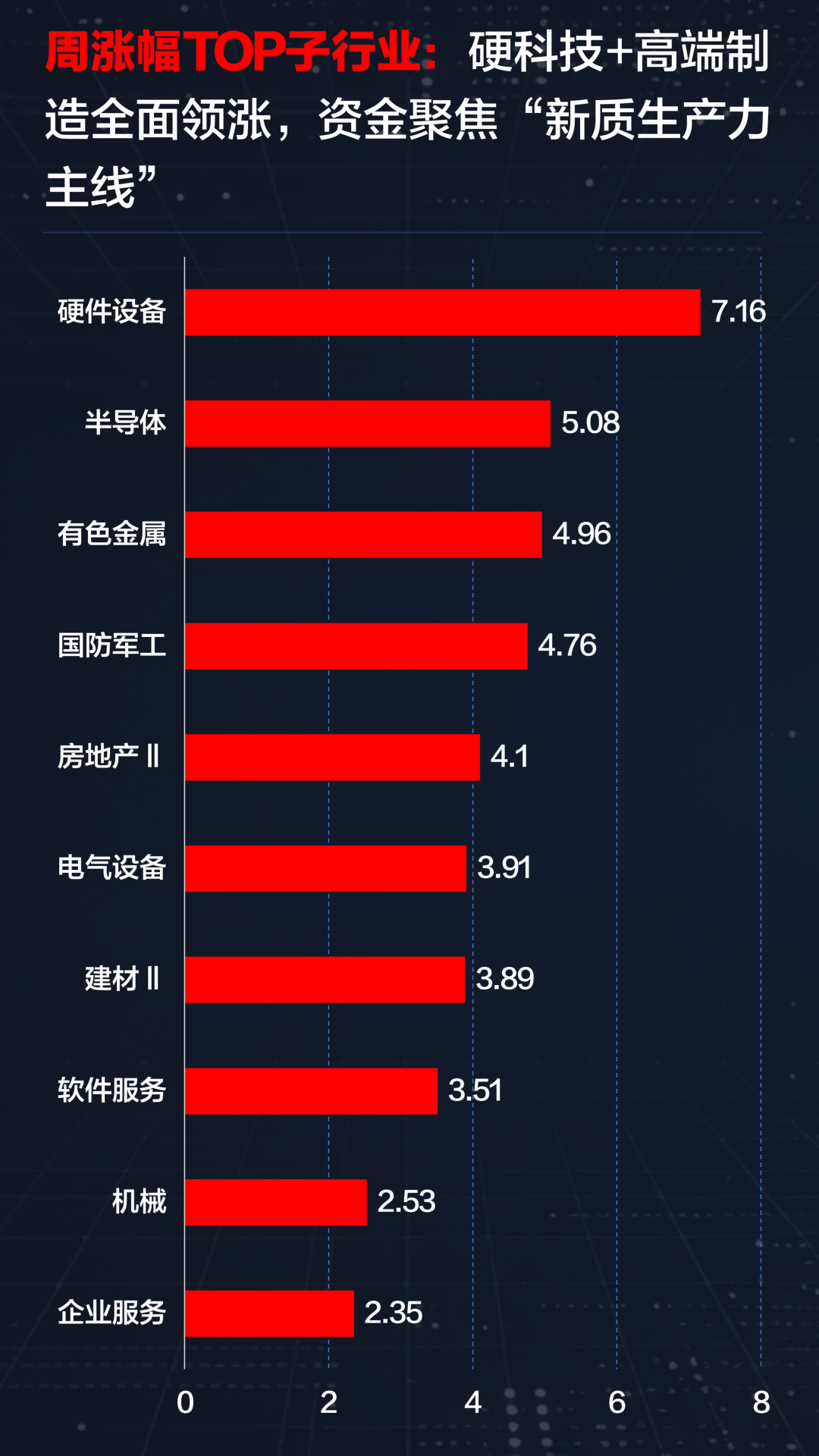 从细分结构看,“新质生产力”方向成为资金集中配置的核心主线,硬科技与高端制造子行业全面领涨;而传统能源与内需消费板块则进入调整区间,成为本周主要拖累。