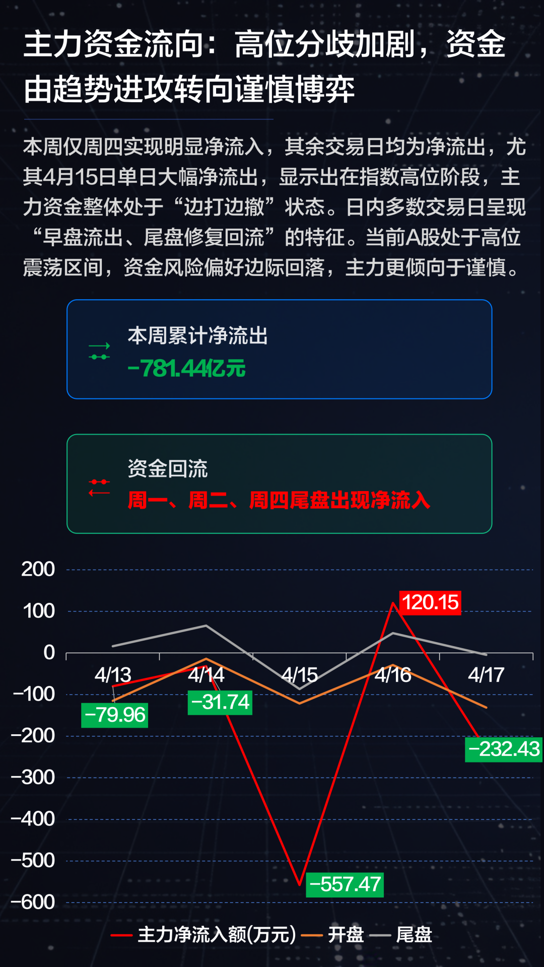尽管指数整体上涨,但资金面已出现明显分歧信号。本周仅周四出现较为显著的主力净流入,其余交易日均为净流出,周内累计净流出达781亿元,显示出资金在高位区间的谨慎态度。