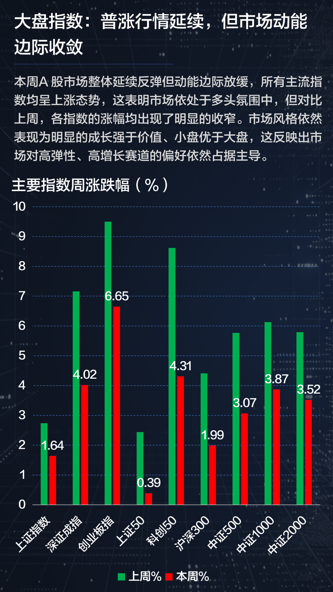 本周A股主要指数全线收涨,延续前期反弹趋势,但与上周相比,各指数涨幅明显收窄,反映市场上行动能边际减弱。从风格上看,小盘成长显著跑赢大盘价值,资金仍聚焦高弹性与高成长赛道。