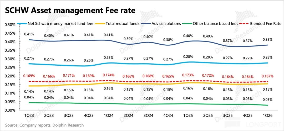 (3)财富管理:增长15%,作为嘉信的品牌特色,发展依旧稳健,包含货基的整体资管规模(基金+投顾)季末达到4.3万亿,同比增长17%,综合资管费率则保持不变。