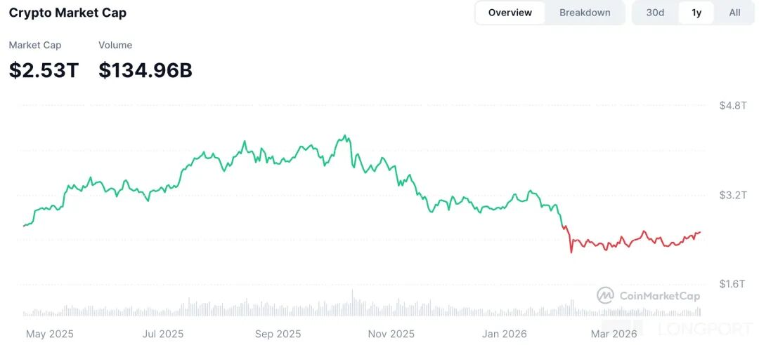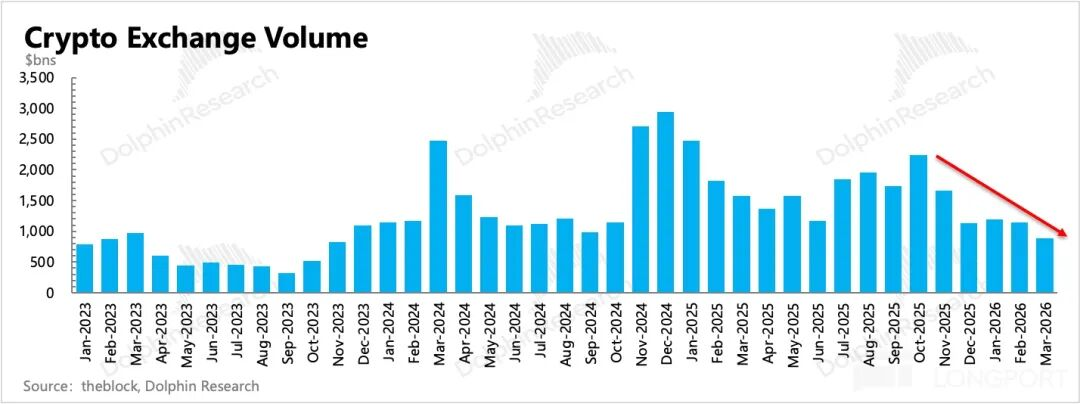 (2)加密货币:本身有《CLARIFY》法案的扰动(3月底银行委员会的草案中仍然反对向仅持有稳定币的用户发放稳定币收益,除非是基于特定活动的奖励),Crypto市场在风偏保守下更是“雪上加霜”——交易量在去年Q4滑坡下进一步探底,整体市场规模也从年初的3万亿出头,一度萎缩至不足2.2万亿。