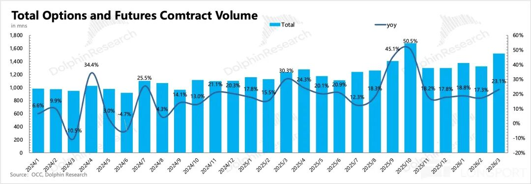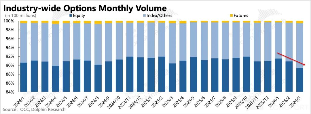 (1)股票:Q1融资余额环比增速明显放缓,且绝对值逐月下降,这最能反映尤其是散户情绪降温明显。衍生品总体交易量环比下降,但细分项中出现结构分化,主要体现在占比更大的期权交易上。其中,股票期权交易占比逐月下滑,一般常被机构投资者用于风险对冲的股指期权交易暴增。