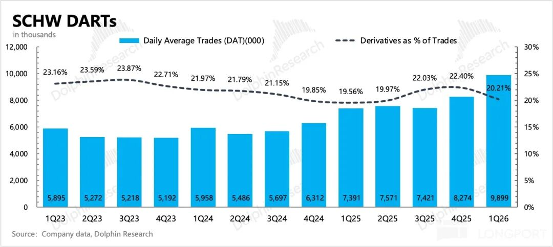 最终,嘉信交易收入四季度同比增长20%,相比去年行情较好的四季度也只是小幅放缓。其中日均交易笔数990万,同比增长34%,衍生品交易笔数占比同比提升、环比下降。
