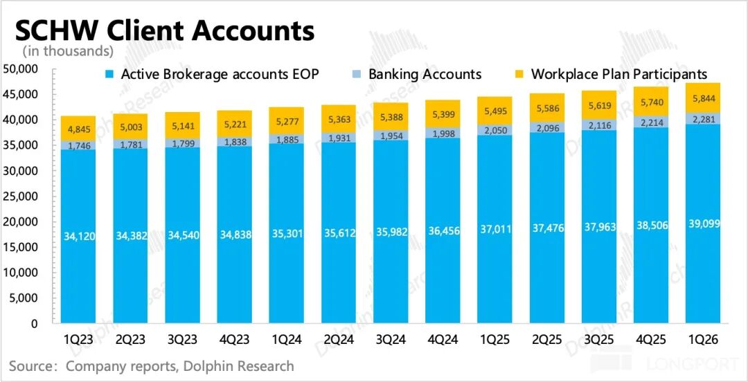 但相比同行,嘉信的表现算是稳健的,Q1活跃经纪账户新高、日均交易笔数DATs也高速增长。这与嘉信用户结构有很大关联,在市场波动较大、亏钱效应放大时,散户情绪通常会快速降温。尤其是年轻散户,股权资产在个人全部财富中的占比和交易灵活性都要比主要配置基金的中老年用户更高。