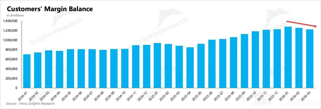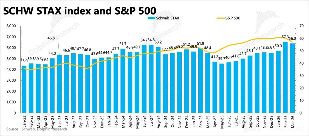 最清晰的对比,从嘉信的STAX指标也能感受嘉信用户的情绪变化。在2月达到最高后,动荡的3月STAX指标也只是稍有下滑。可以来对标的就是去年4月的关税战,嘉信的STAX指标从3月的48.4直接下降到41.2,投资者恐慌程度明显高于这次。