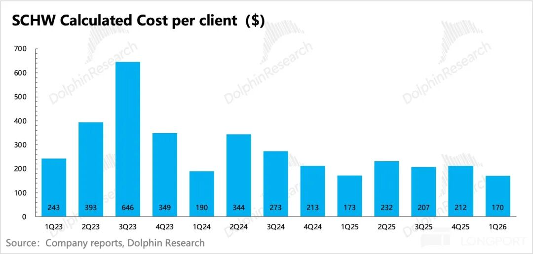 长期品牌心智也使得嘉信要获得持续的用户增长,获客成本也相对稳定,基本在200美元/人上下波动。一季度综合计算下人均获客成本170美元。