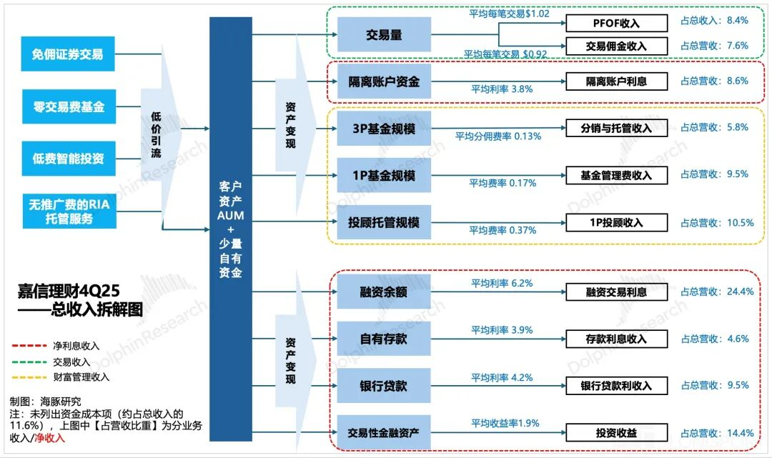 在交易、基金降佣的大趋势下,嘉信依靠存贷息差、投资固收类的金融资产带来的利息收益,弥补了交易收入的缺口。从集团整体来看,商业模式逐步定型——通过免佣金的证券交易,低通道费、零交易费的基金申赎,低咨询费的智能投资以及无推广费的独立RIA托管服务来引流,壮大整体客户资产规模(AUM)后,最终以资产生息(存、贷款利息/投资收益)为主的创收模式。
