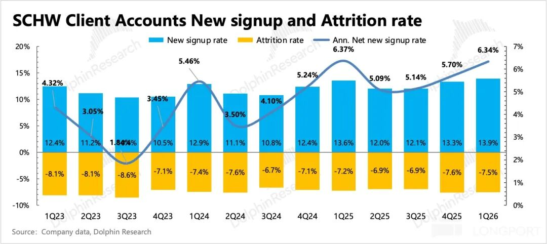 (1)经纪账户数毛增130万,剔除不活跃的71万,净增59万。年化来看,相当于14%的毛增,8%的流失,最终带来6%的净增。