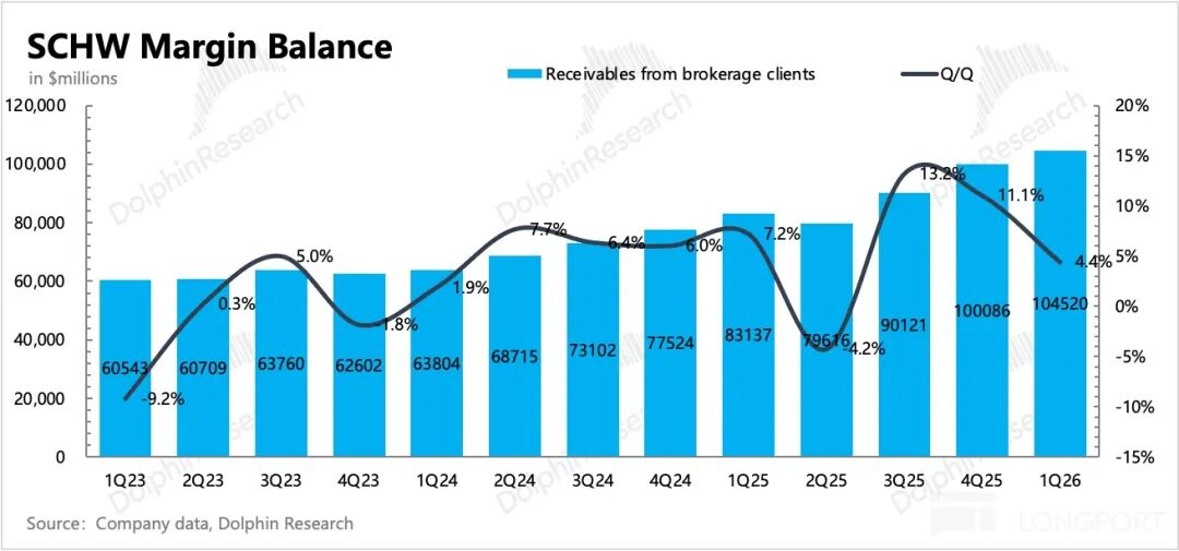 贡献增长的还是用户的融资需求,一季度末融资余额环比增长4%,若加上RIA托管资产采取多空策略时增加的融资余额,在环比增长13%。但后者并不属于向嘉信融资,不对嘉信产生利息收入,因此我们认为应该剔除后还原嘉信本身平台内用户的需求情况。