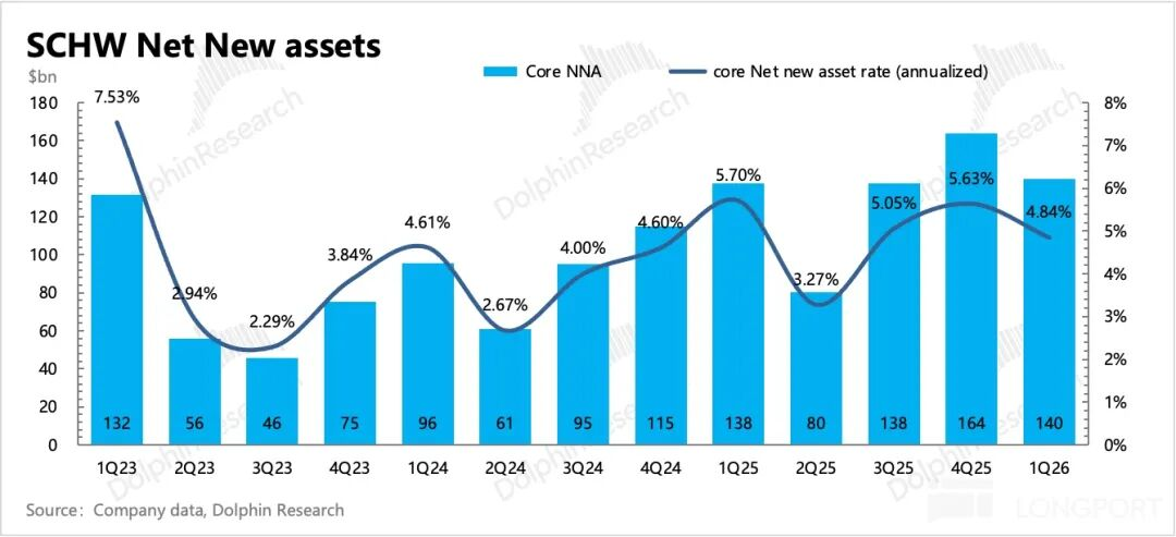 管理层一直维持指引NNA长期增速在5%~7%区间,但对今年的指引预期定在5%,从3月的逆势增长来看,嘉信内生增长力仍然稳定。