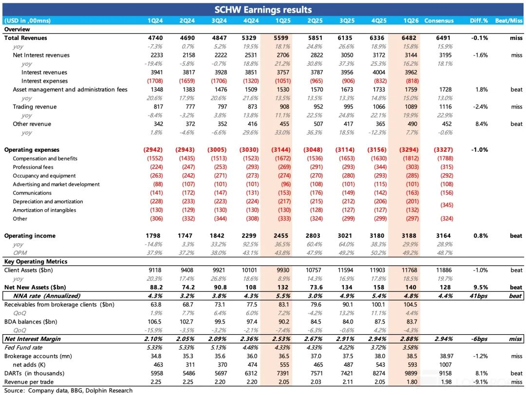 嘉信理财一季度业绩其实本身还可以,但市场预期相对饱满,可能会介意收入略微miss的表现,以及息差收益率(NIM)环比下降的瑕疵。