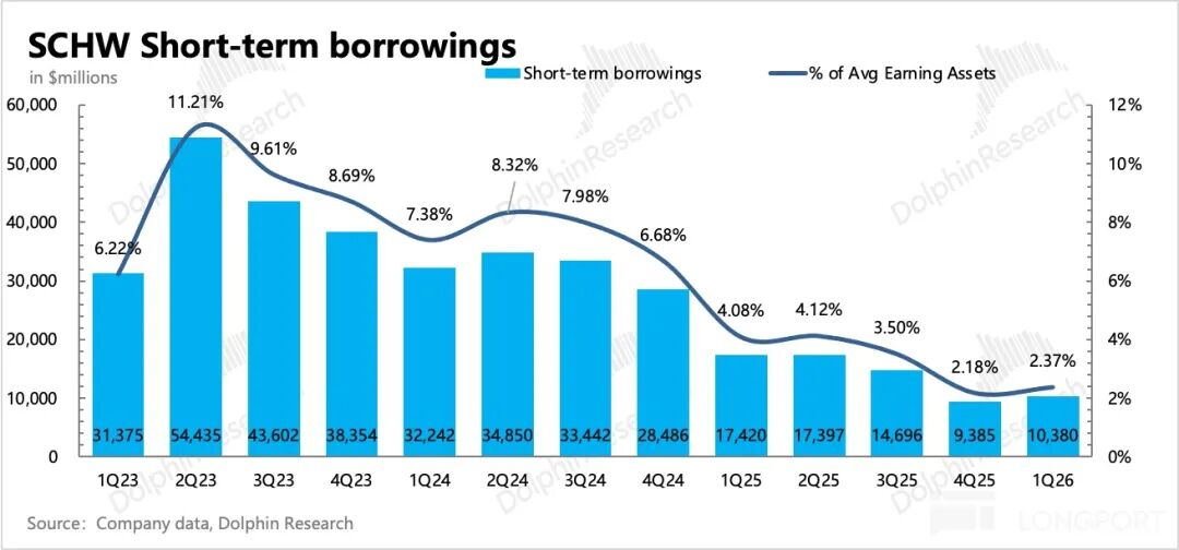 结合嘉信融资余额的增长趋势不错(在剔除RIA客户多空策略的融资需求后,平台用户产生的融资余额规模仍环比增长了4%,优于行业表现),海豚君猜测短期借款的增加有可能是针对融资需求的应急操作,若属实,从中长期视角则应该将这个“扰动”积极看待。而前两年的联邦借款则在有序偿还中,本季度末只剩下不到13亿。