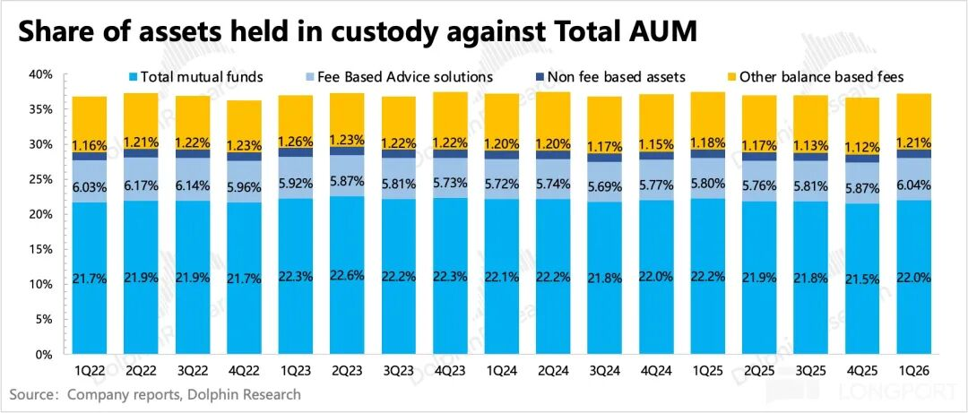 (1)资产净增加(NNA):一季度NNA为1400亿,年化增速达到4.8%。这里面包括了175亿共同基金在清算到期后按计划转出的影响,还原后年化增速5.3%超过全年5%指引(3月NNA在地缘摩擦下甚至实现了7.5%的增速)