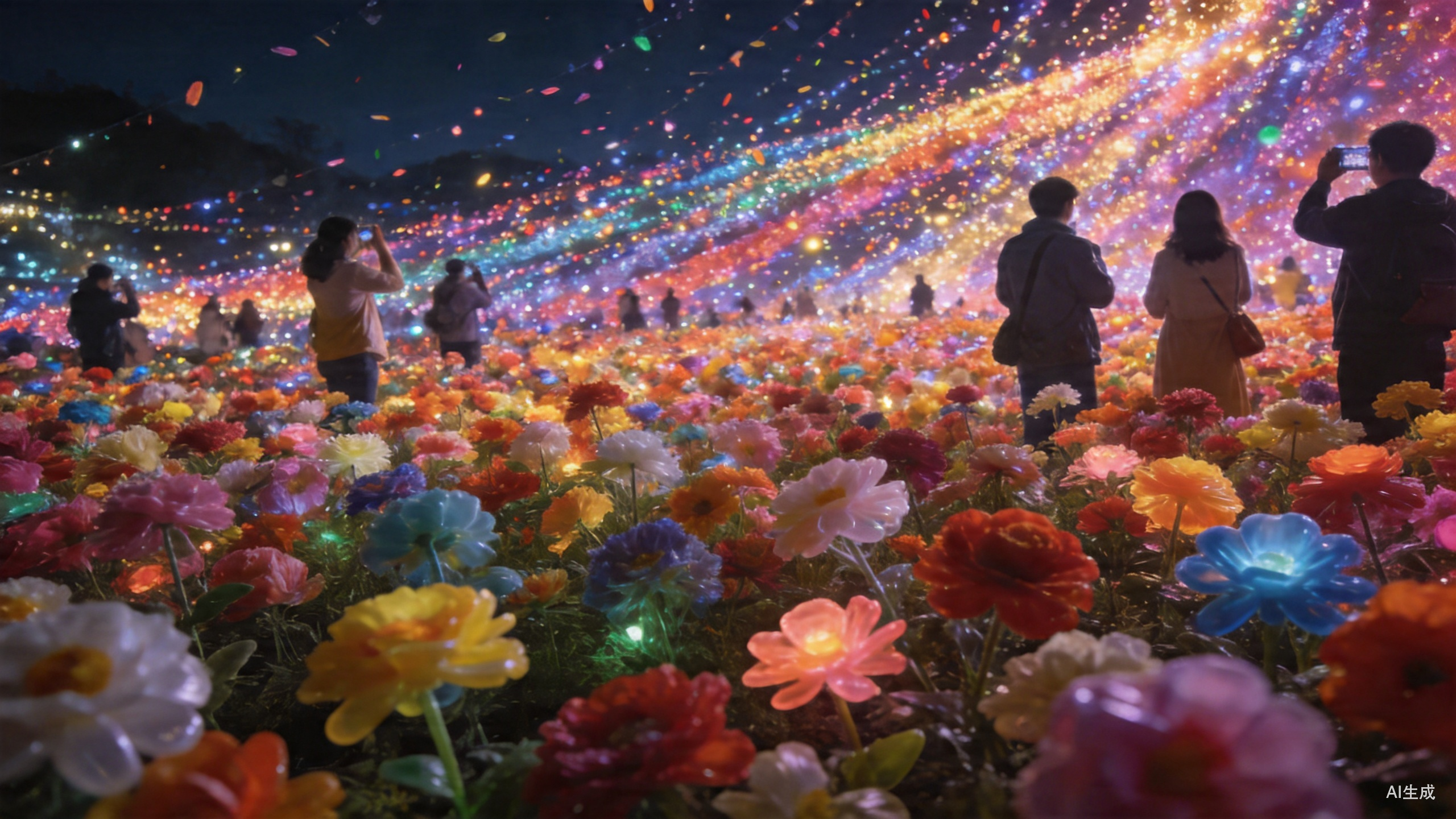 全国各地的一些赏花地似乎共享同一种夜间装扮技巧,把五颜六色的灯带往花丛里堆。