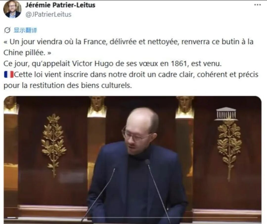 他说希望有一天,洗心革面的法兰西能把赃物还给中国。