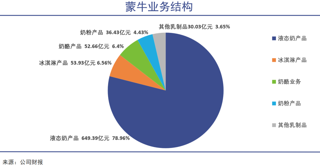 液态奶占比过重仍然是蒙牛的重要问题。2025年,其整个营收盘子里液态奶占了将近八成,相比之下,伊利的液态奶占比仅60%,并且在冰淇淋、奶粉等多种领域对蒙牛大幅领先。