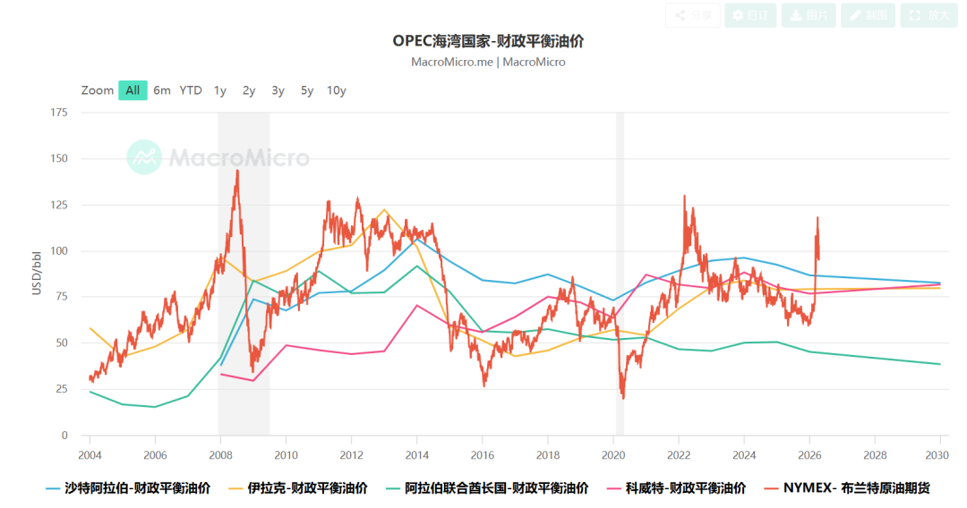 这意味着如果美以伊战事最终导致美国选择推进石油美元范式的转变,美国和俄罗斯以及战争中受损的OPEC各国都有意愿维持更高的原油价格;而且考虑到以沙特各国为代表的海湾国家近年来一直饱受低油价影响,处于财政赤字状态,各国都无意愿主动下调油价。