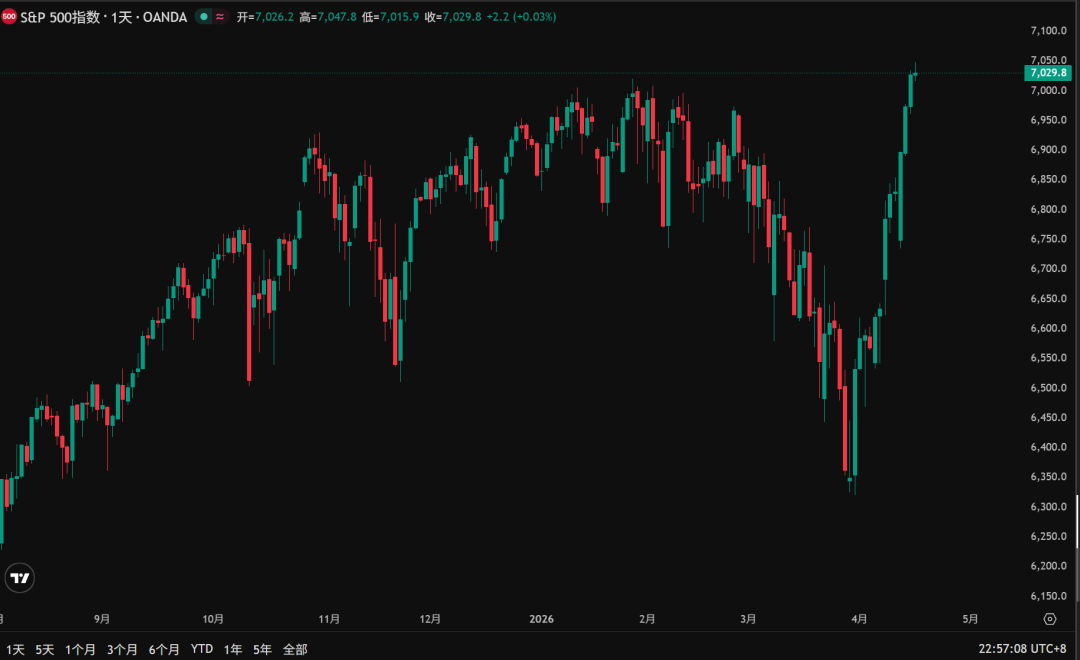 3月23日,特朗普开启他在美以伊战事中的第一次TACO之后,市场就跟随其社交媒体账号的言论上蹿下跳,在TACO与不TACO之间来回摇摆。随着美伊开启停火及释放出第二轮谈判的信号,美股指数尤其是纳斯达克指数在美国时间4月13日的交易日中收复了自2月28日以来的所有跌幅,并随后开始冲击历史新高。