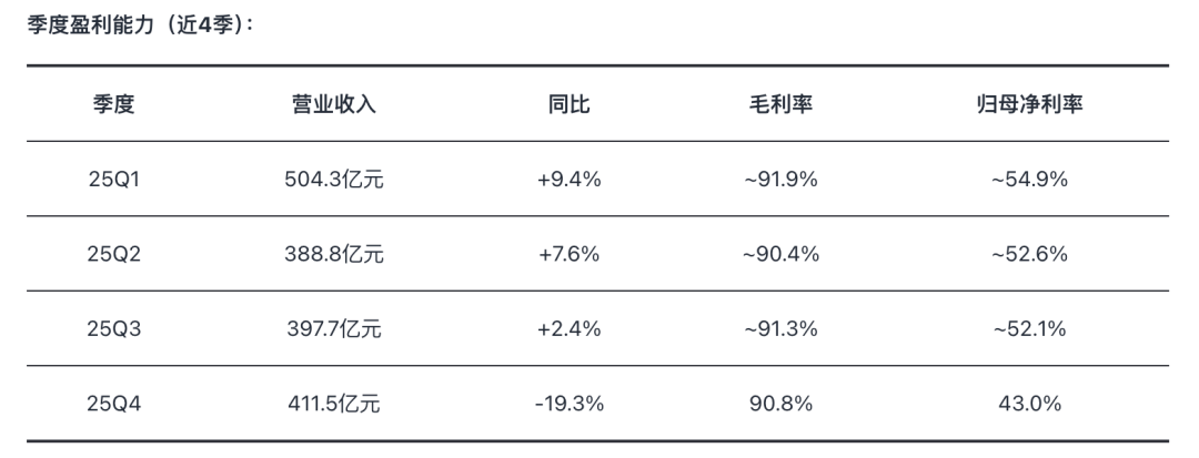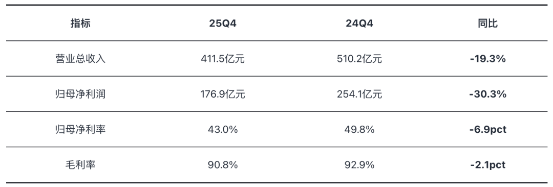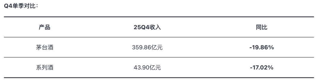 问题主要出在第四季度,2025Q4单季度利润降幅(-30.3%)大幅超出预测,这在历史上是很少见的,一方面是白酒整体行业需求非常弱,系列酒销售下滑严重,同时茅台Q4主动暂停向经销商发货(尤其非标品),渠道主动去库存,并开启市场化改革,清理历史包袱。