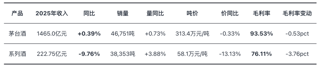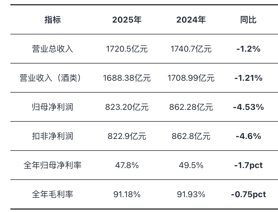 先简单过一下财务数据,2025年茅台自上市以来首次年度收入和净利润双降,毛利率和净利率等指标均出现同比下降。