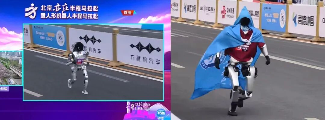 如果说有些机器人秉持着“比赛第一”的态度,那么还有一些机器人是来展示“OOTD”(今日穿搭)的。有机器人穿着定制小外套登场,有机器人顶着一头飘逸假发,颇有种“我是来跑T台不是来跑21公里”的架势。