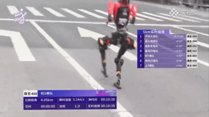 不过,尽管有许多限制,但仅仅一年过去,这帮“硅基跑友”的能力就已突飞猛进。今年的冠军,是深圳荣耀智慧科技的齐天大圣队的自主导航机器人“闪电”,它身高169cm,净时成绩50分26秒。亚军与季军使用的也均为自主奔跑的“闪电”机器人,成绩都在54分钟以内。