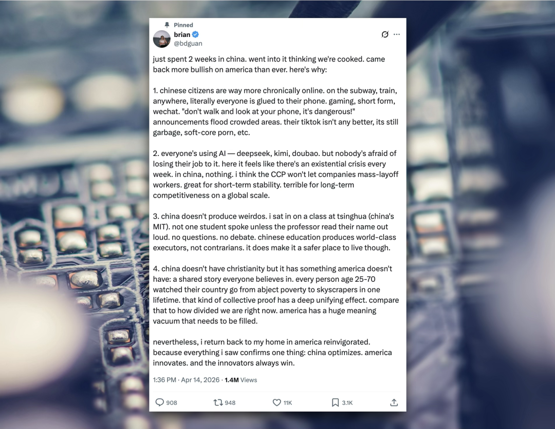 他带着一种“我们完蛋了”(We're cooked)的焦虑感来到中国,待了两周后,却带着一种极其复杂的“看多美国”的情绪回到了硅谷。