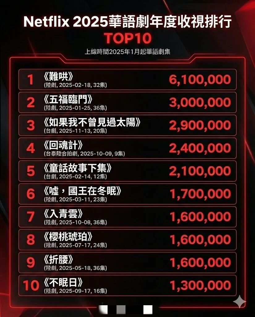 根据NMEA数据,2024年以前,台剧产量平均60-80部,但在2024年台剧产量仅有41部,其中仅有7部获得国际流媒体平台青睐。而来到2025年,台剧产量基本维持在40部上下,但仍有投资、采购台剧的国际流媒体平台,仅剩Netflix、Disney+,数量也与大陆视频平台采购量持平,维持在4-5部。