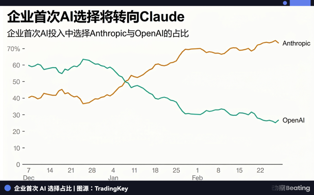 据企业支出管理平台 Ramp 的监测数据,2026 年 3 月,在企业首次购买 AI 服务的新增资金中,高达 73% 流向了 Anthropic,OpenAI 的份额降至 27%,仅仅 10 周前,双方还是 50:50 的均势。