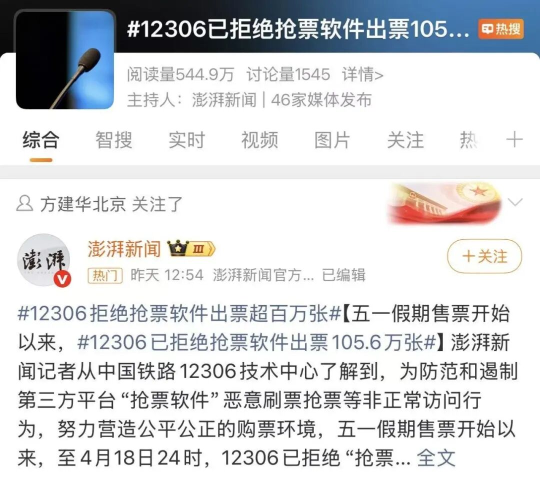 最近两天,#12306已拒绝出票105.6万张的新闻冲上热搜。