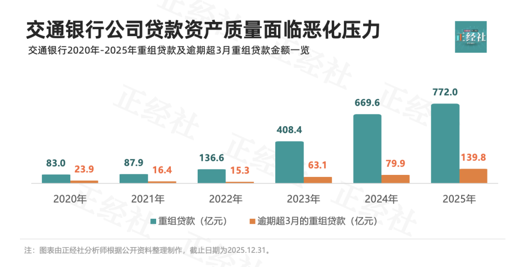 但是,正经社分析师注意到,公司类的大量不良贷款因为贷款重组而延后暴露了。2020年至2025年,重组贷款金额分别为82.99亿元、87.92亿元、136.60亿元、408.36亿元、669.59亿元、772.01亿元,占比分别为0.14%、0.13%、0.19%、0.51%、0.78%、0.85%,2021年至2025年呈持续上升之势;逾期超过三个月的重组贷款金额分别为23.94亿元、16.25亿元、15.33亿元、63.06亿元、79.85亿元、139.78亿元。