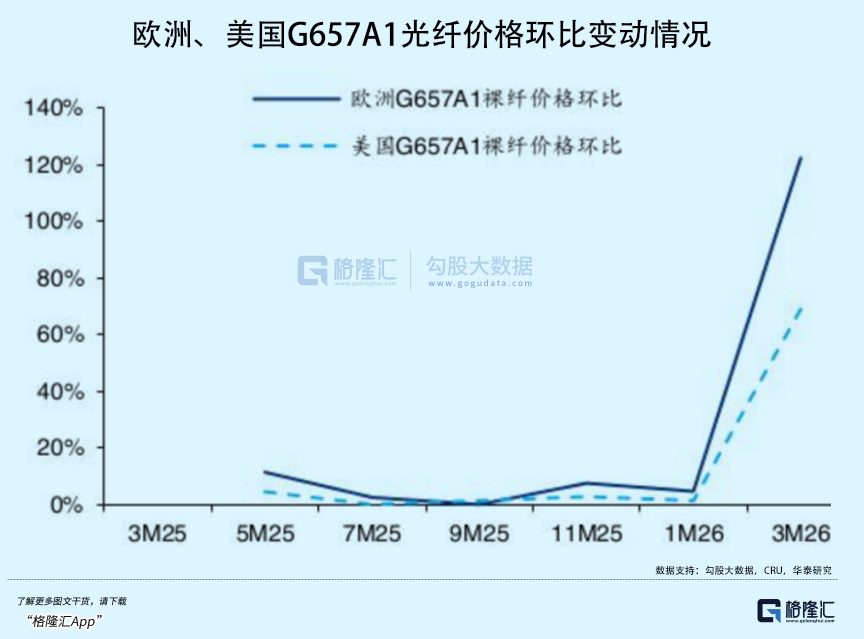 据机构分析,涨价已蔓延全球。数据显示,3月欧洲G657A1较1月涨122%,美国涨69%。供不应求的局面持续加剧,光纤交货周期从正常的8到12周拉长到60周。
