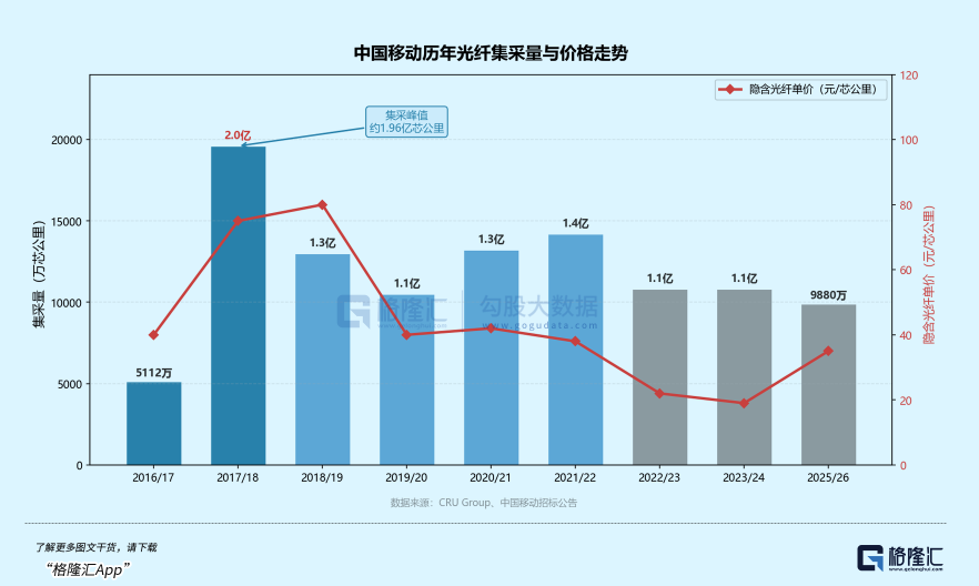 2024年全年均价才大约20元/芯公里,但数据显示,2026年1月其价格就突破40元,单月涨75%的信号已经难以忽视。到了3月,根据CRU Group的数据,中国市场的裸纤价格同比暴涨418%。3月底中国移动一项集采招标推算,光纤单价已经破100元/芯公里。