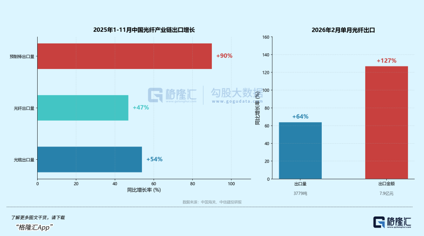海外产能瓶颈导致订单大量外溢到中国。2025年前11个月,中国光缆出口1654万公里,同比增长54%。光纤出口增47%,预制棒出口增近90%。