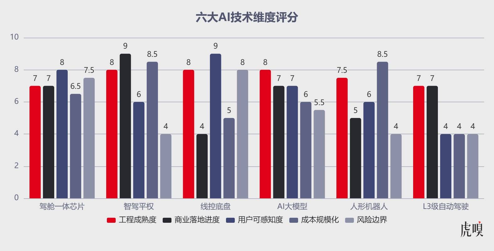 为了更加清晰地让大家感知六大AI技术,虎嗅从工程成熟度、商业落地进度、用户可感知度、成本规模化以及风险边界五大维度,进行了满分10分制的评分。我们希望这一预判能够给汽车产业的良性发展带来更多助力,因为对于身处其中的每一个玩家而言,敬畏用户、敬畏安全、敬畏漫长的工程验证周期,或许才是穿越这场淘汰赛唯一的通行证。
