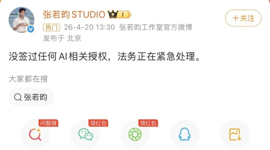 在2026爱奇艺世界·大会上,爱奇艺高级副总裁刘文峰透露,纳逗Pro已经有超100位爱奇艺深度合作艺人同意入驻纳逗Pro艺人库。但随之而来的则是张若昀率先辟谣,此后王楚然、李一桐、于和伟、王玉雯等艺人否认签署AI相关授权。
