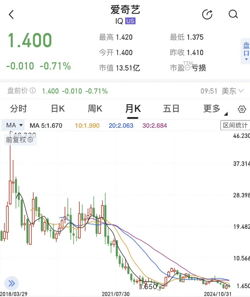 因为爱奇艺2024年Q4第一次盈利,加起来不到2亿人民币,而它的内容采购成本是100+亿,现在的股价已经跌倒1.4美元了,被SEC列入预摘牌名单。